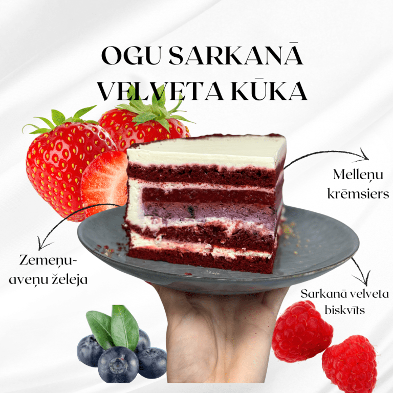 Sastāvdaļas: Krēmsiers, saldais krējums, mellenes, zemenes, avenes, kviešu milti, cukurs, kefīrs, rapšu eļļa, kakao, olas, želatīns, pektīns, etiķis, soda, cepamais pulveris, citronskābe