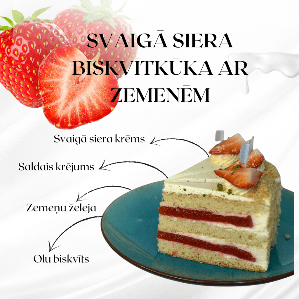 Sastāvs: kviešu milti, svaigais siers, saldais krējums, cukurs, kefīrs, zemenes, rapšu eļļa, olas, etiķis, dzeramā soda, cepamais pulveris, sāls, pektīns