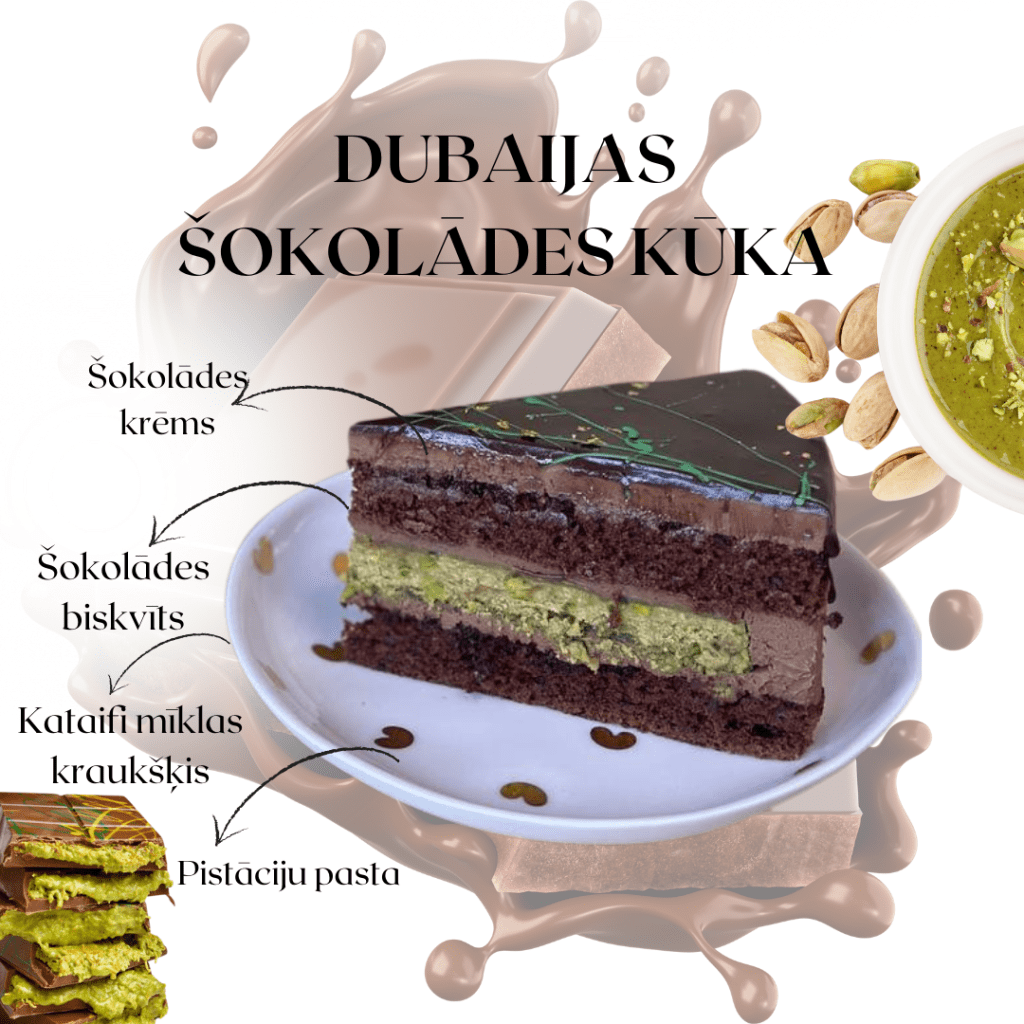 Sastāvs: pistāciju gabaliņi, pistāciju pasta, kataifi mīkla, svaigais siers, saldais krējums, kviešu milti, cukurs, kefīrs, piena un tumšā šokolāde, olas, kakao pulveris, etiķis, dzeramā soda, cepamais pulveris, sāls.