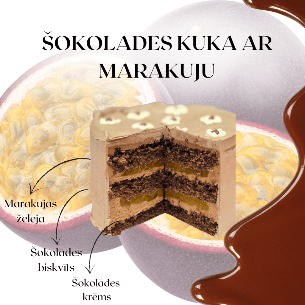 Sastāvdaļas: kviešu milti, cukurs, saldais krējums, tumšā šokolāde, marakujas biezenis (100%), krēmsiers, kefīrs, rapšu eļļa, olas, etiķis, soda, cep.pulv, pektins