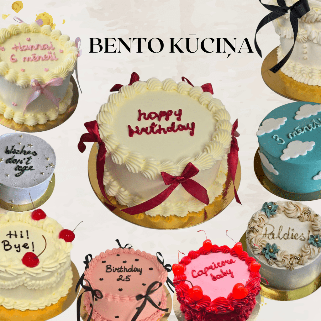 Mini Bento (1-2 personām). Diametrs 9cm, svars aptuveni 300grami. Pieejamās garšas: sarkanā velveta, šokolādes, maigā aveņu kūka vai šokolādes kūka ar marakuju. Cena 18€, iespējams uzrakstīt ne vairāk kā 2 vārdus