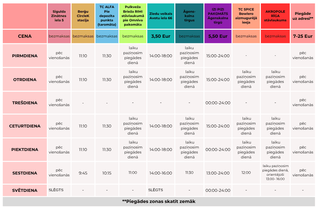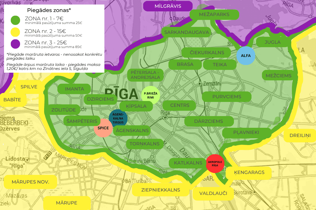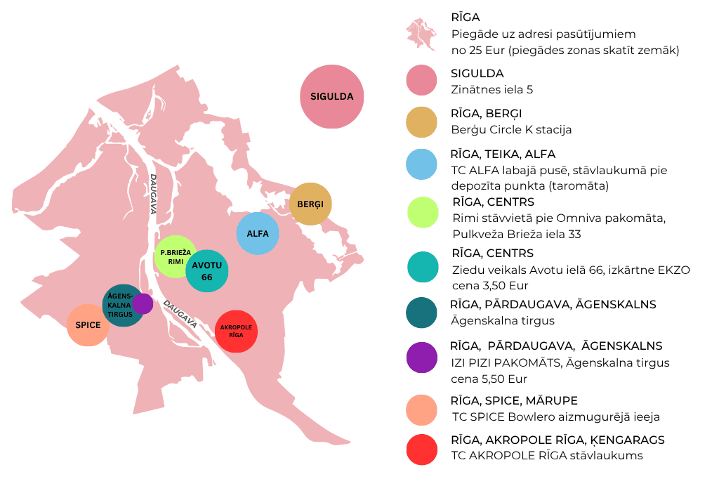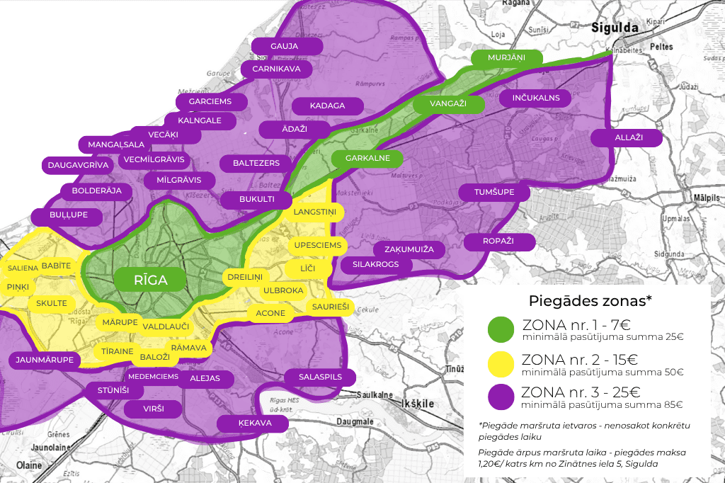 Piegāde Mūsu pagatavotās kūkas ir iespējams saņemt Rīgā un Siguldā, iepriekš vienojoties par jums ērtāko saņemšanas laiku un vietu. Piegādi uz adresi veicam pasūtījumiem no 25 Eur. Lūdzu iepazīstieties ar pasūtījumu saņemšanas iespējām: